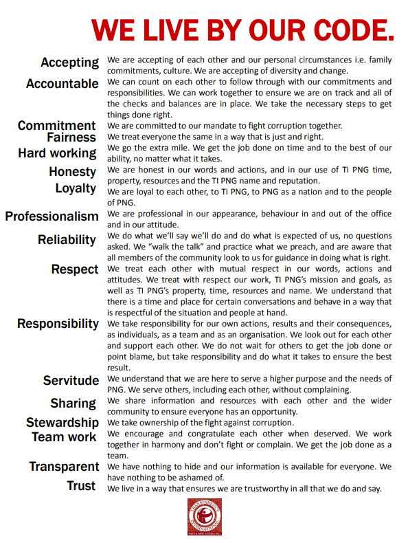 If you have any other specific questions, please contact Kalia Maraga on 323 4917/ 323 7517 or email info@transparencypng.org.pg we will be more than happy to assist.
