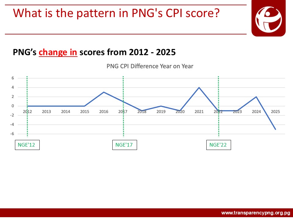 “The drop in PNG’s 2025 CPI score is not an isolated result; it demonstrates a multi-year trend linked with our electoral cycle,” said TIPNG CEO, Ms. Arianne Kassman. “PNG’s scores show a pattern of slight improvement over 5 years, followed by a sharp decline during election year—a cycle that must be broken to ensure a fair 2027 election. What we do in 2026 will determine the integrity of our democracy in 2027.”